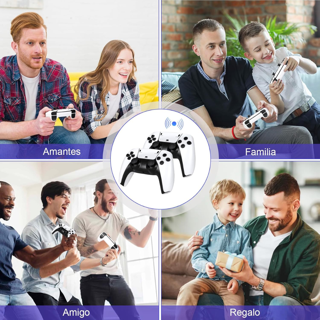 Viene con 2 controles inalámbricos incluidos, pero también puedes conectar controles con cable USB si lo prefieres. Solo enchufa y listo — Plug & Play.